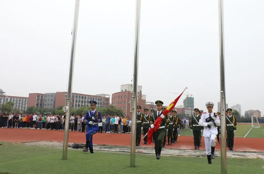 由新高一年级学生组成的国旗护卫队,迈着铿锵有力的步伐,护卫着鲜艳的五星红旗,正步走向升旗台。擎旗手升旗、擎旗、撒旗、放旗,每一个动作坚定有力。